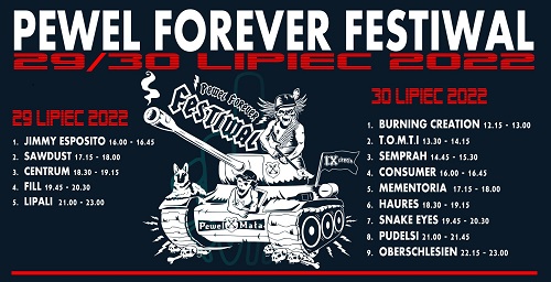 Cześć załoga…!!! WOJUJEMY !!! Zapraszamy Was na IX Edycję “Pewel Forever Festiwal”. W tym roku festiwal w wersji dwudniowej < 29/30Lipiec > Zapamiętaj ! Dzięki dla wszystkich zespołów, które zgłosiły chęć zagrania na festiwalu i dla osób, które już szykują koktajle na przybycie do Nas …! Wiele się działo i się dzieje ale nic nie stoi na przeszkodzie aby w tym roku powalczyć na Pewlańskich terenach…! Gwarantujemy dobrą zabawę zarówno muzyczną jak i imprezową…! Jak co roku zresztą. Zapraszamy do udziału w tegorocznej edycji > IX PFF <. LineUp poniżej, na bogato uzbrojony !!! Pozdrawiamy i zapraszamy !!! Załoga PFF